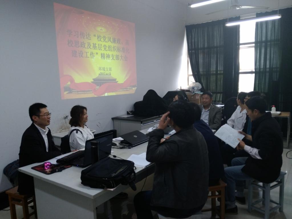 4月17日下午,能环学院环境系党支部在东校区建工南楼211召开专题会议,学习贯彻2017年校党风廉政建设工作会、高校思政及基层党组织标准化建设的会议精神和工作要求。支部全体党员参加了会议。