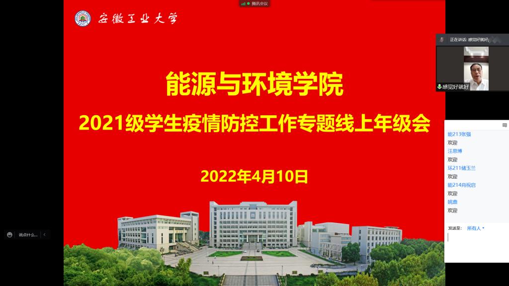 为贯彻落实上级疫情防控各项指示精神,从严从实从细做好学院疫情防控工作,筑牢广大学生疫情防控思想防线,4月8日至12日,能环学院领导按照包保制分工,分别下沉到各自负责年级召开疫情防控工作线上会议,学院全体学生1300余人参加了会议。