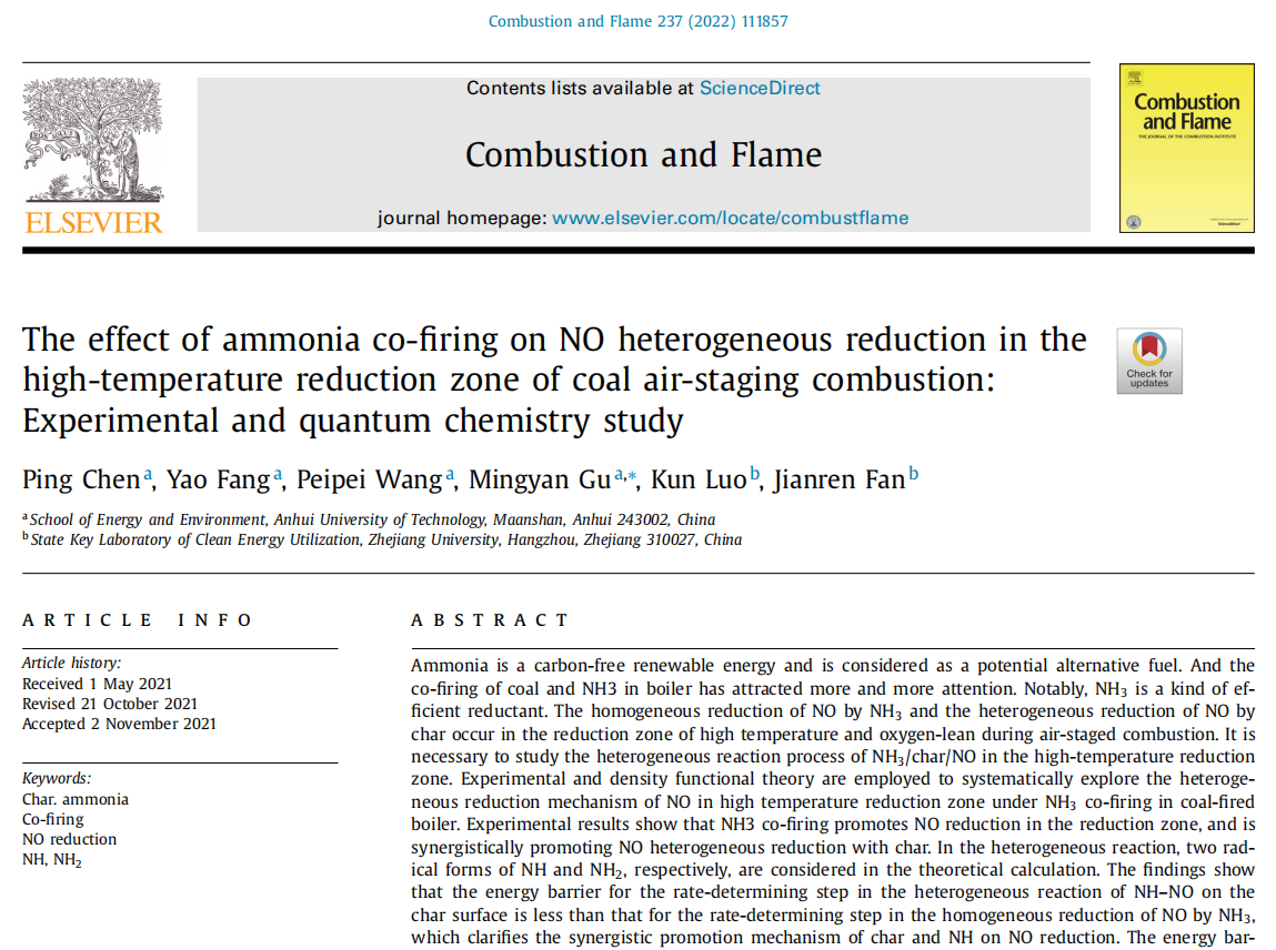 近日,安徽工业大学能源与环境学院青年教师陈萍在燃烧领域国际权威期刊《Combustion and Flame》上,以第一作者身份发表了题为“The effect of ammonia co-firing on NO heterogeneous reduction in the high-temperature reduction zone of coal air-staging combustion: Experimental and quantum chemistry study”的论文。该论文通讯作者为能源与环境学院顾明言教授,合作者为浙江大学能源工程学院樊建人教授和罗坤教授。安徽工业大学为第一单位,研究工作得到国家重点研发计划项目(2017YFB0601805)的资助。