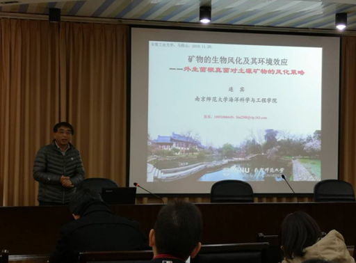 11月28日上午,南京师范大学海洋科学与工程学院连宾教授,应邀来学院做题为“矿物的生物风化及其环境效应”的学术报告。报告会由能源与环境学院副院长盛广宏主持,相关学科教师、研究生和本科生聆听了报告。报告以矿物的生物风化及其环境效应为主题,围绕外生菌根真菌对土壤矿物的风化策略,探讨了微生物作用下土壤矿物风化的主要过程与机制以及所伴随的相关元素的环境地球化学行为和效应。最后连宾教授和与会师生就相关热点问题进行了讨论。