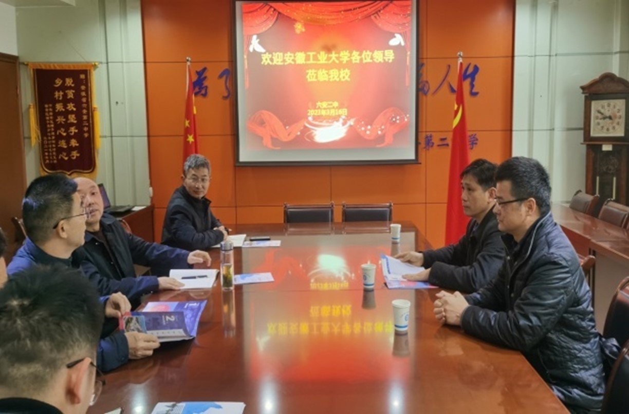 在六安二中,钱付平一行受到六安二中校长关世宏的热烈欢迎,钱付平就安徽工业大学的建校历史、学科专业建设、人才培养、人工智能—英才班、创新及就业、学生资助、硕士博士学位点建设等方面进行了介绍。钱付平还向六安二中送达优秀学子喜报和招生宣传手册,双方进行合影留念。