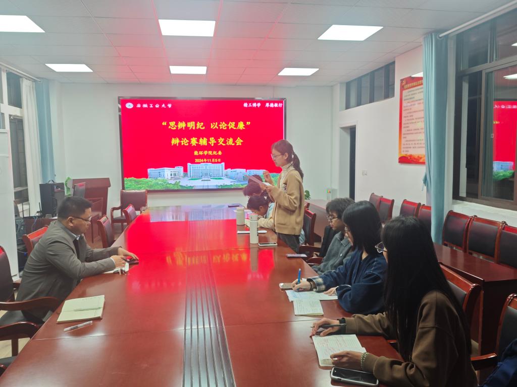 根据校纪委《关于举办2024年安徽工业大学“思辨明纪 以论促廉”大学生辩论赛的通知》相关要求,为加强对学院辩论赛的组织领导和审核把关,能源与环境学院纪委于11月5日晚上在能源楼325专题开展了辩论赛辅导交流会。会议由2024级辅导员范浩东主持,学院党委副书记、纪委书记卫军帅莅临指导,院辩论队全体队员参与。
