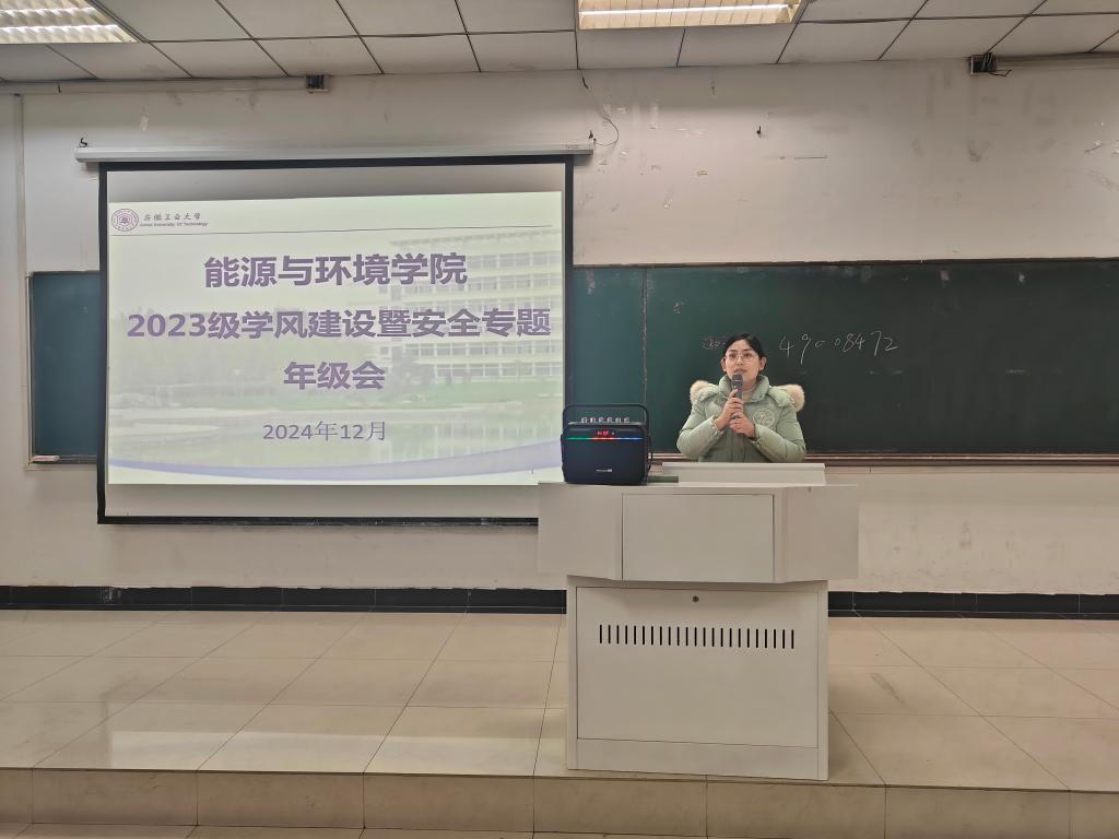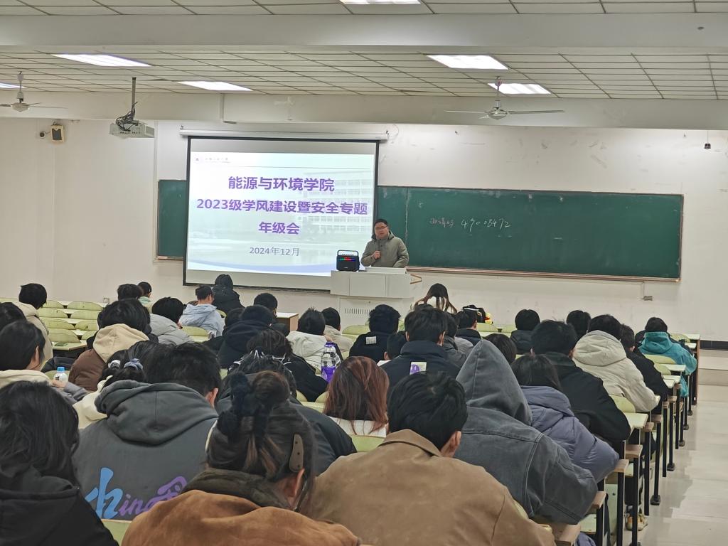 总结学风建设现状,提高诚信考试意识,引导学生树立安全意识1227上午,能环学院于教三南103召开了期末学风建设暨安全教育专题年级会。会议由2023级辅导员费丽主持,副院长卫军帅、辅导员吴飞、周虹晶和全体学生参会。