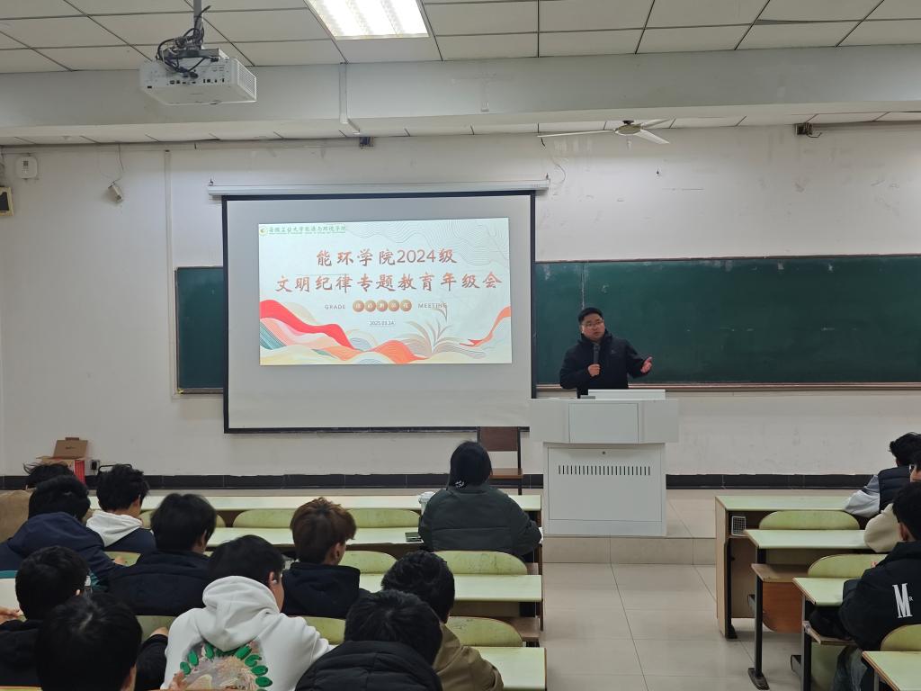 为进一步加强学生文明意识和纪律观念,增强学生的社会责任感和法律意识,深入推进学院“八好之家”建设,能源与环境学院启动“文明纪律”专题教育系列活动。从大一年级开始启动,3月14日中午,能源与环境学院在教三南103教室召开了2024级学生文明纪律专题教育年级会,2024级全体学生参加会议,会议由辅导员范浩东主持,学院党委副书记、副院长卫军帅主讲。