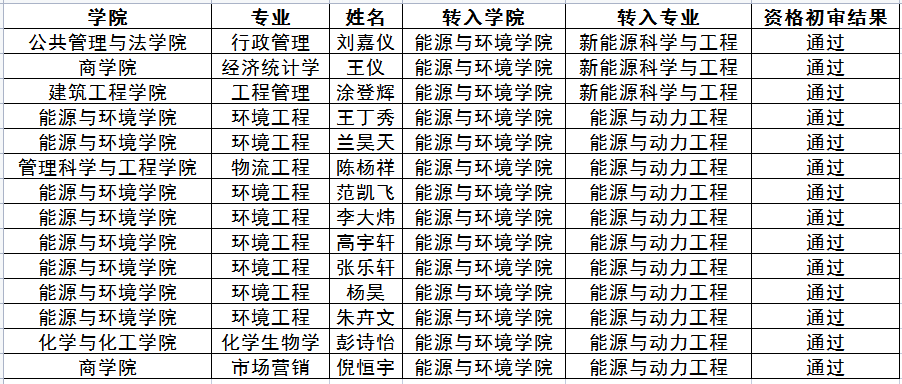 根据《安徽工业大学全日制本科学生转专业实施细则》([2023]4号)和《能源与环境学院转专业考核方法(2023)》,本着公平、公正、公开的原则,能源与环境学院转专业考核小组对申请转入我学院学生进行资格审核,刘嘉仪等14人通过资格初审,面试时间及形式另行通知,请各位同学保持通信畅通。