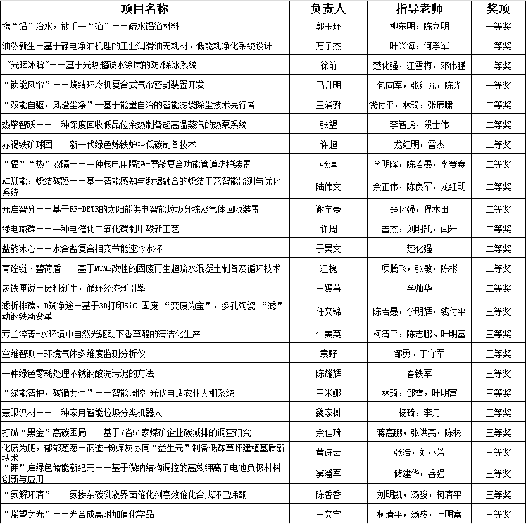 根据《“招行杯”第十八届全国大学生节能减排社会实践与科技竞赛第一轮通知》《关于组织参加第十八届全国大学生节能减排社会实践与科技竞赛安徽工业大学“威达环保杯”选拔赛的通知》等有关要求,我校组织了安徽工业大学“威达环保杯”全国大学生节能减排社会实践与科技竞赛校内选拔赛。本次竞赛旨在激发大学生的创新意识,提高实践能力,推动绿色发展,促进节能减排技术的创新与应用。本次校赛评选一等奖4项,二等奖8项,三等奖13项。现将结果公示如下: