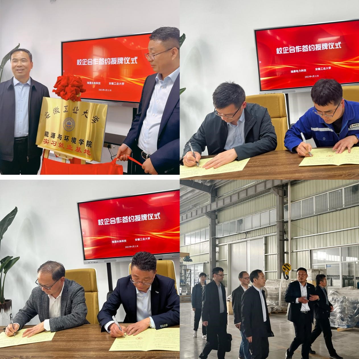 座谈会后,凤杰分别与四家企业代表共同为“安徽工业大学能源与环境学院产学研合作基地”揭牌。学院党委副书记谢文平和教学副院长盛广宏分别与四家企业签订了大学生就业基地协议和实习基地协议。与会人员在企业负责人的陪同下一同参观了海澄水务科技集团有限公司和东方日升(安徽)新能源有限公司生产车间。