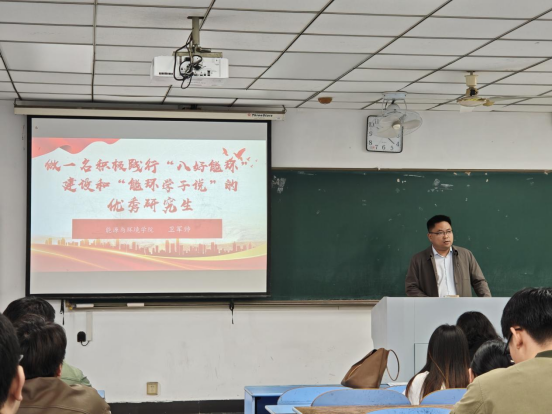 卫军帅作了题为“做一名积极践行‘八好能环’建设和‘能环学子说’的优秀研究生”的主旨发言。他结合当前宏观经济形势与能源环境领域的发展趋势,深入分析了本届研究生面临的机遇与挑战。他强调,成为一名优秀的研究生,不仅要在学术科研上追求卓越,锤炼过硬的专业本领,更要注重综合素质的提升,特别是要树立正确的择业观、就业观和事业观。